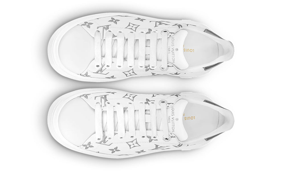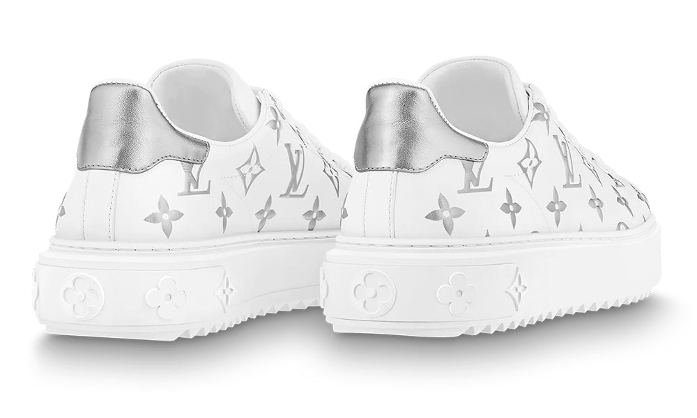 This version of Louis Vuitton’s emblematic Time Out Trainers comes in white calf leather debossed with a metallic Monogram pattern. The design is complemented by a spoiler in matching metallic leather. This model is distinguished by its fashionable, elevated outsoles decorated with motifs of Monogram Flowers.