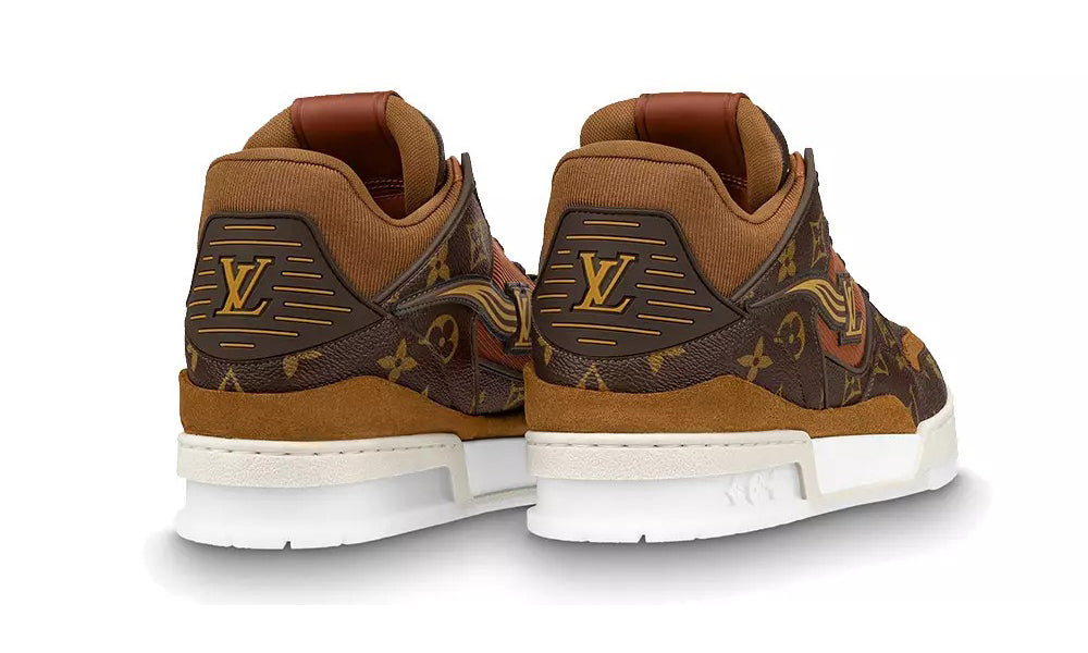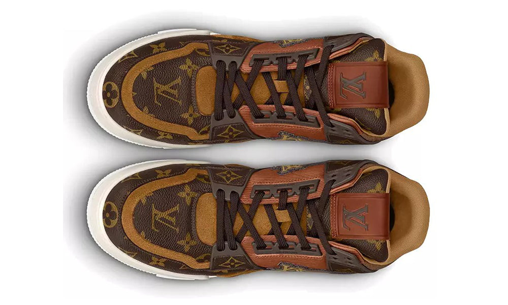 The LV Trainer sneaker, created by Louis Vuitton Artistic Director Virgil Abloh, is revisited in Monogram Ebene and Monogram Reverse canvas. Inspired by basketball sneakers, this cult design has an elaborately constructed upper, which takes seven hours to stitch. It is finished with a contrasting white rubber outsole, which is decorated with Monogram Flowers.