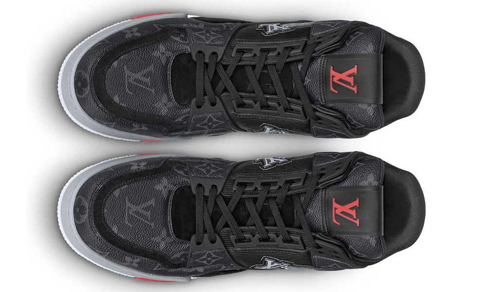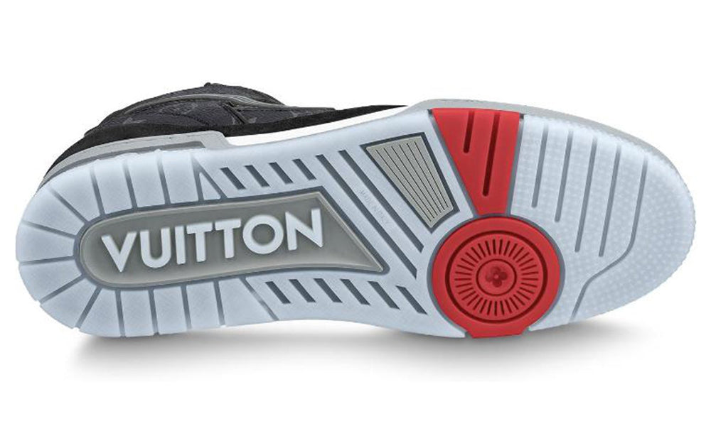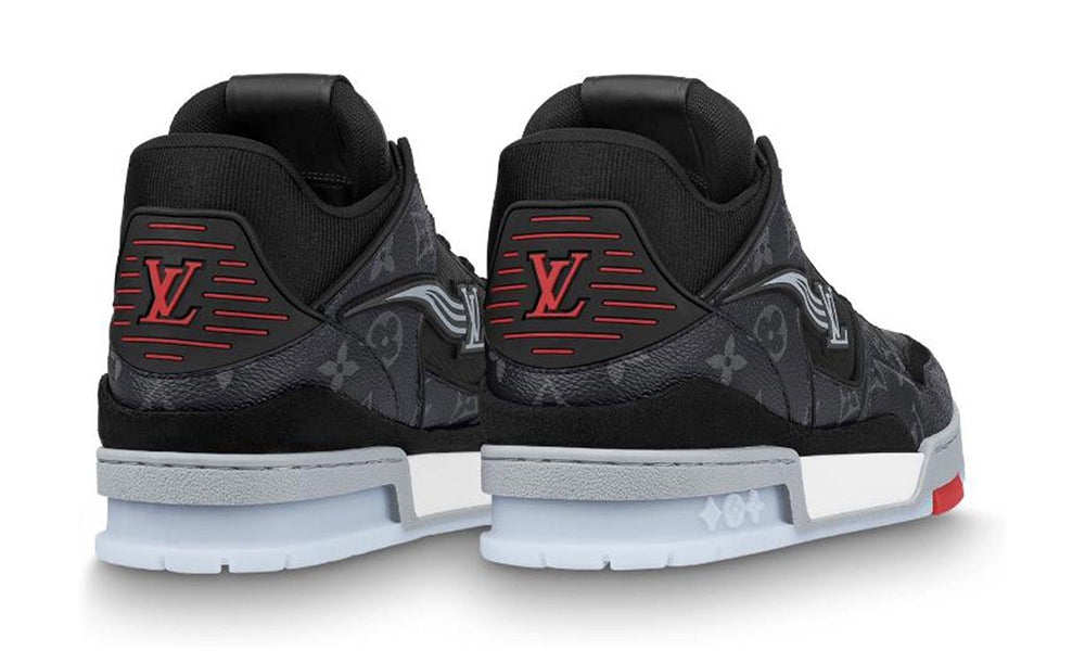 The LV Trainer sneaker, created by LV Artistic Director Virgil Abloh, is revisited in Monogram Eclipse and Monogram Reverse canvas. Inspired by basketball sneakers, this cult design has an elaborately constructed upper, which takes seven hours to stitch. It is finished with a contrasting white rubber outsole, which is decorated with Monogram Flowers.