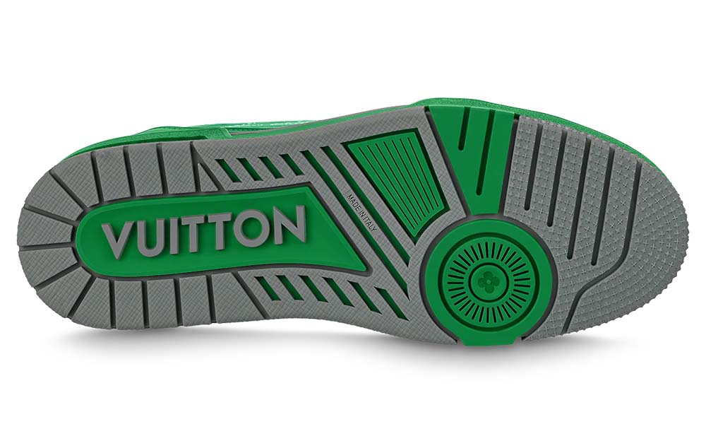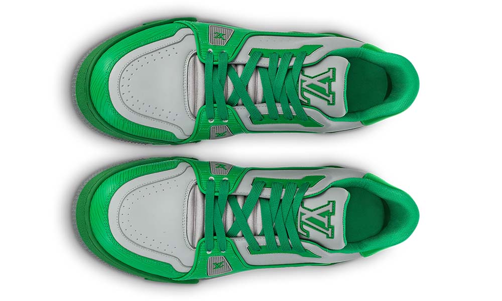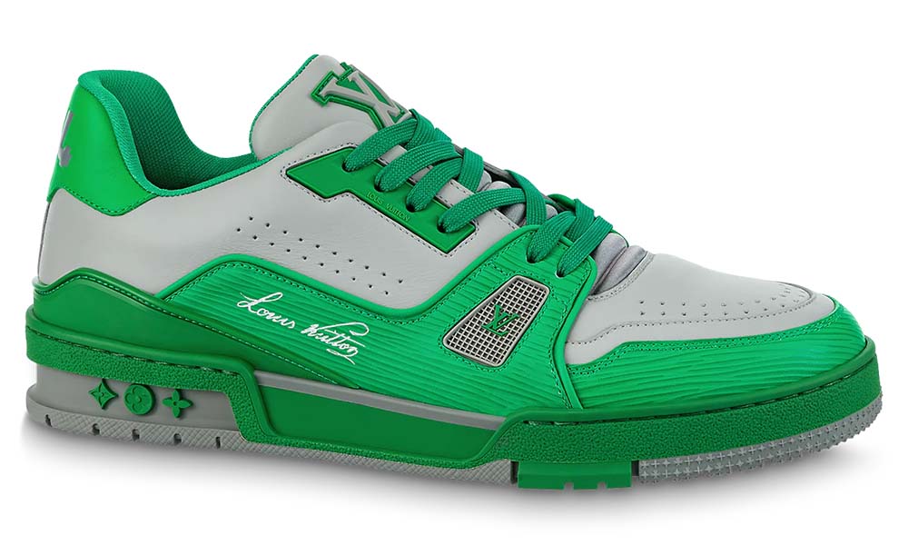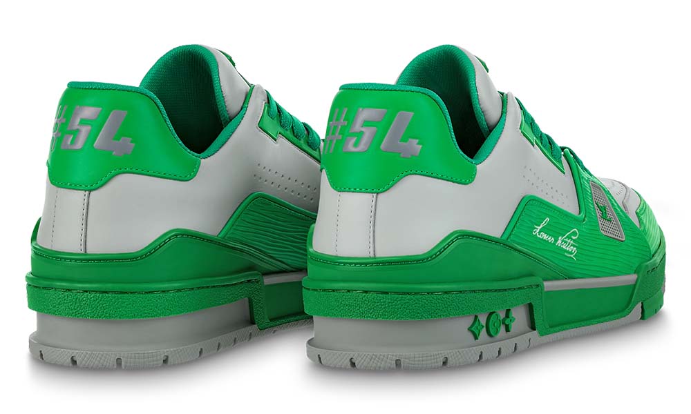 The LV Trainer sneaker comes in a bicolor version combining smooth calf leather with Louis Vuitton’s emblematic Epi calf leather, recognizable for its distinctive grain. This model, which was inspired by vintage basketball sneakers, is notable for its rich detailing, including the Louis Vuitton script signature, embossed in silver on the side.