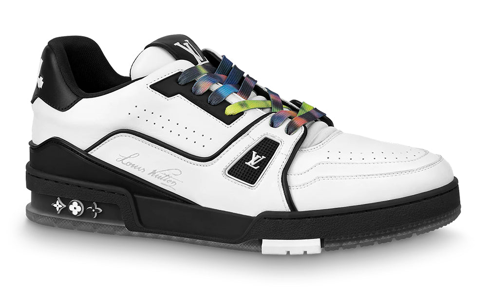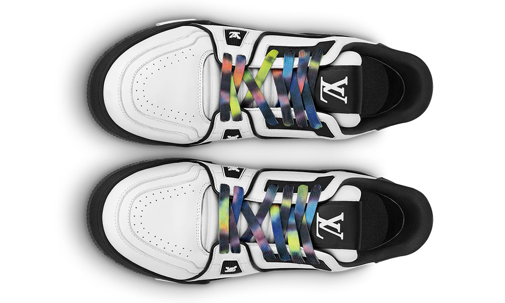This graphic interpretation of the cult LV Trainer sneaker comes in bicolor calf leather. Tie-dye laces, inspired by the season’s ready-to-wear collection, add a touch of color. This model bears Virgil Abloh’s handwritten Louis Vuitton signature on the side, while the #54 logo at the back refers to 1854, the date the House was founded.