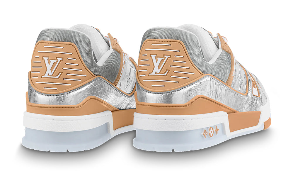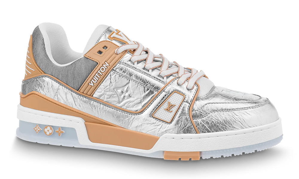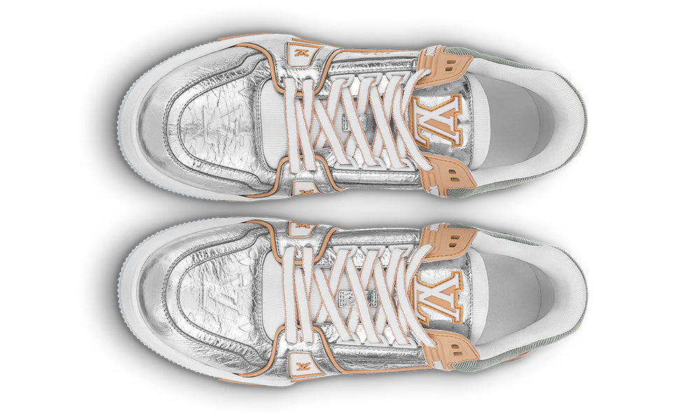 For LV’s Fall-Winter 2021 men’s show, the LV Trainer sneaker was revisited in metallic silver leather embossed with the Monogram pattern. This model, designed by Artistic Director Virgil Abloh and inspired by basketball sneakers, features an elaborately constructed upper which takes seven hours to stitch. It bears the Vuitton signature on the side.