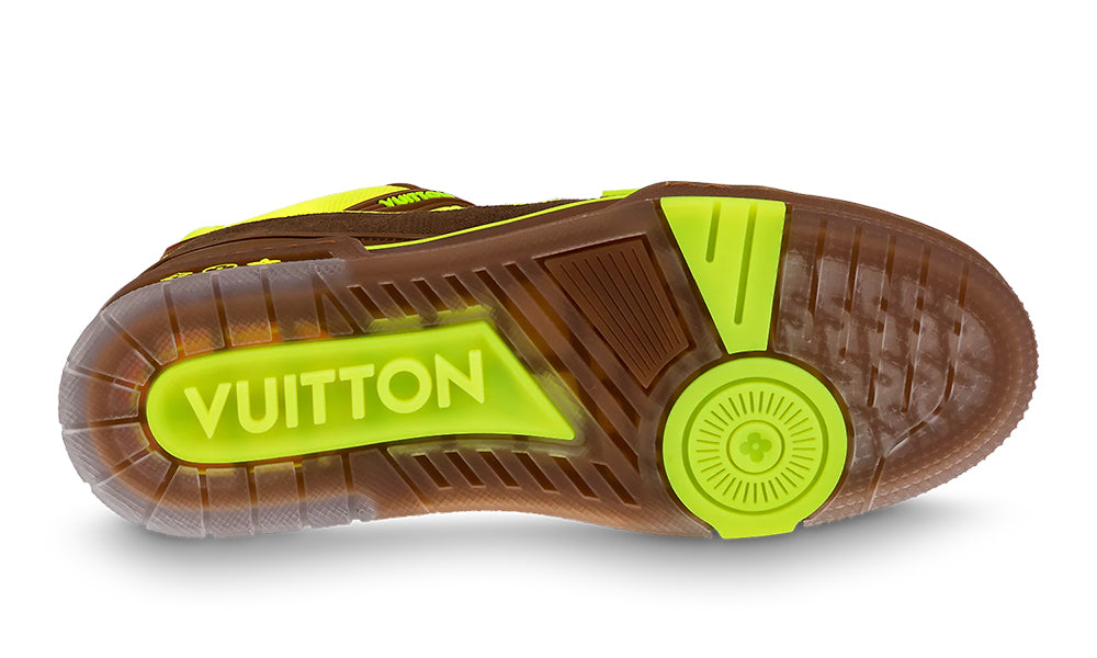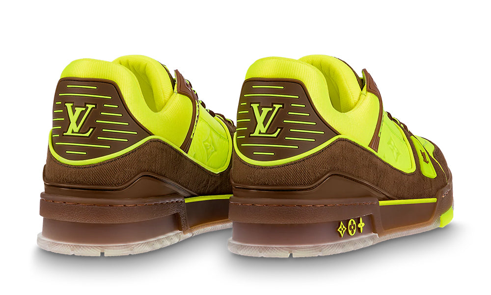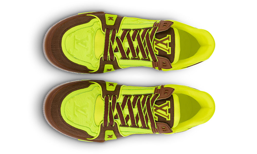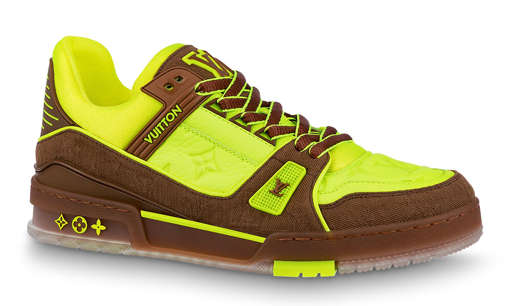 This version of the LV Trainer sneaker combines fluorescent, Monogram-embossed nubuck calf leather with brown Monogram-denim trim. Fluorescent colors are a key feature of the LV Fall-Winter 2021 men’s collection. This cult style, designed by Artistic Director Virgil Abloh, was inspired by vintage basketball sneakers.
