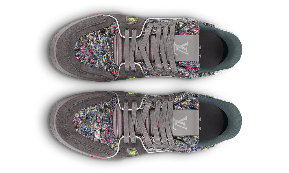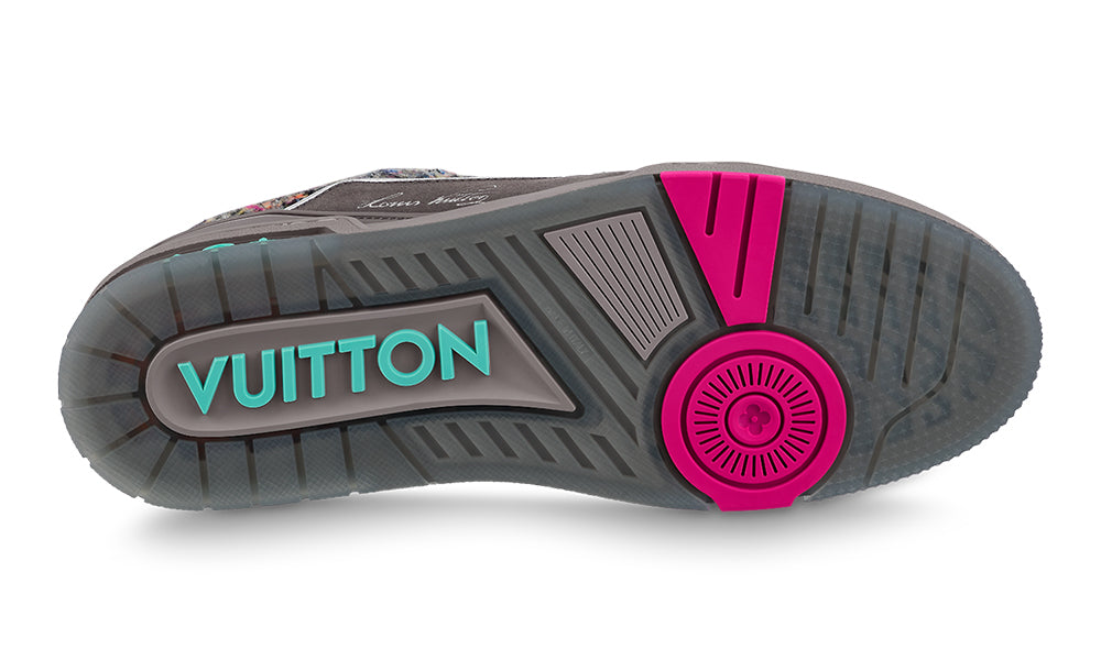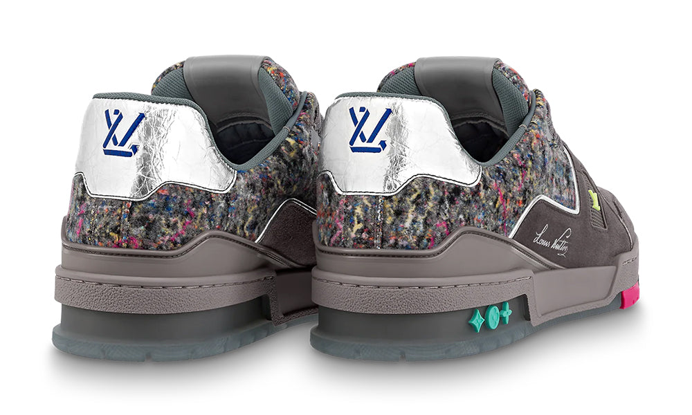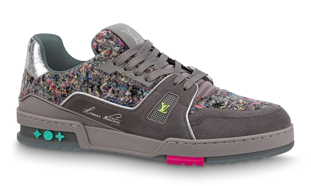 This reinterpretation of the LV Trainer sneaker, seen at the LV Fall-Winter 2021 men’s show, comes in suede calf leather and felt, which is one of the key materials of the season. The design is complemented by colorful rubber details, which pick up shades within the felt, and metallic leather trim at the back.