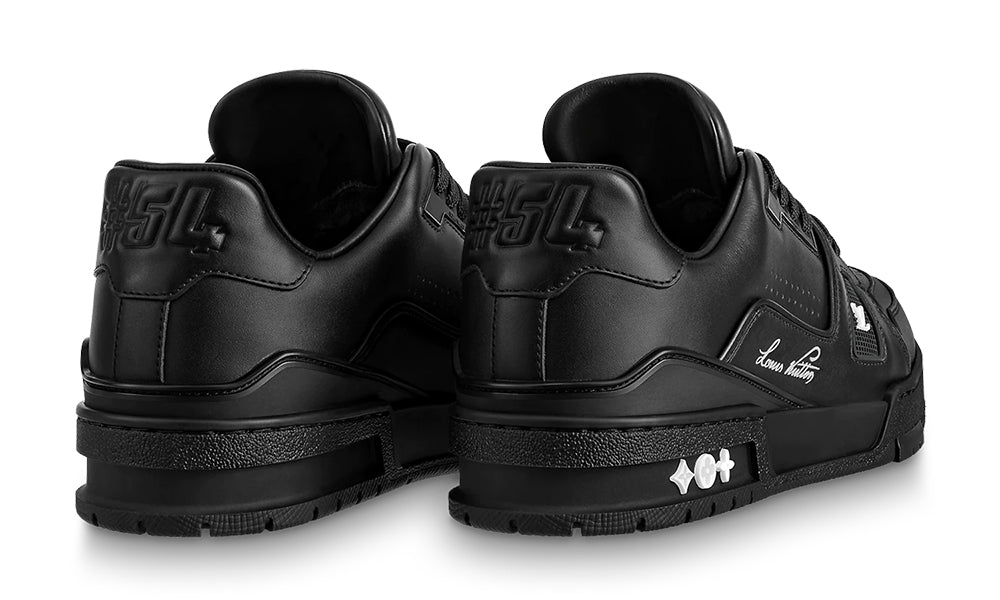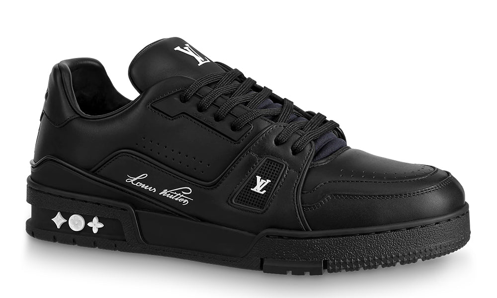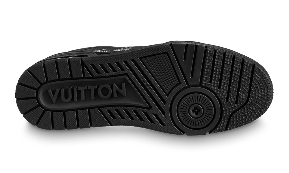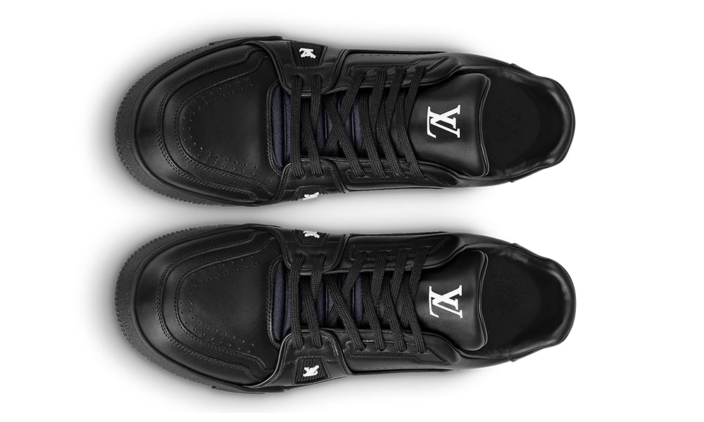 This wintry version of the iconic LV Trainer sneaker comes in supple calf leather with a warm wool lining. The rubber outsole is color-matched to the upper for an all-black look, complemented by red detailing on the LV Initials. Virgil Abloh’s handwritten Louis Vuitton signature is printed in silver on the side.